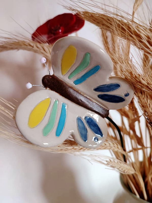 Vase (émail maison à base de cendre de cheminée, hauteur 18 cm), bouquet de fleurs et papillon